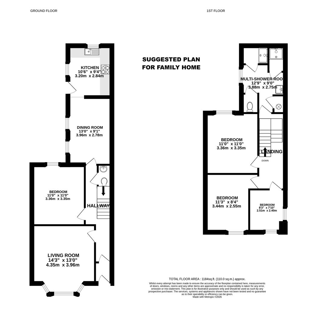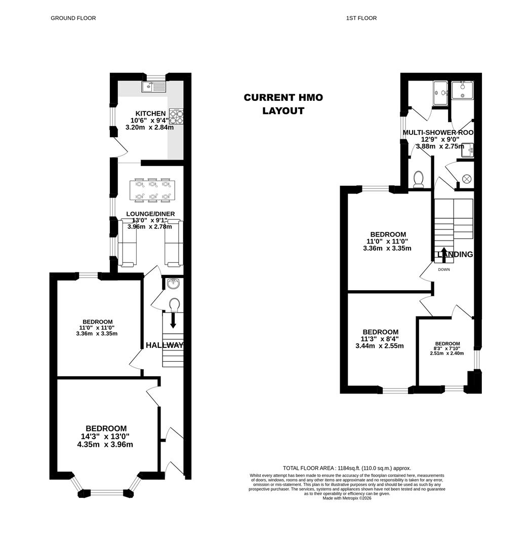 From the entrance hallway, the ground floor provides four principal rooms plus a convenient cloakroom/WC. There is a generous lounge/diner (ideal as a shared social space), a well-proportioned kitchen, and two ground-floor double bedroom, a particularly appealing feature for letting or those wanting a home office/guest room at this level. On the first floor, a central landing leads to three further bedrooms along with a standout multi-shower room, an excellent asset for shared occupancy or a busy household.