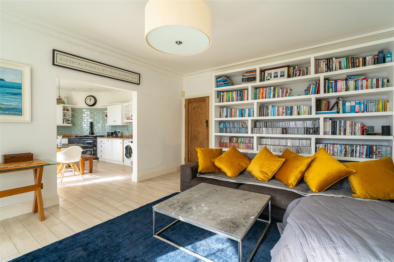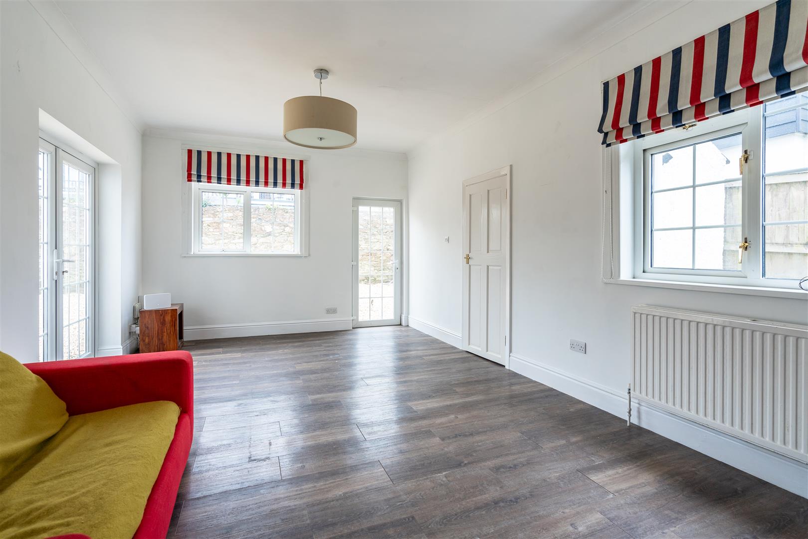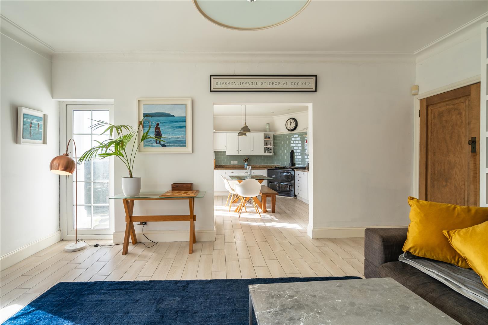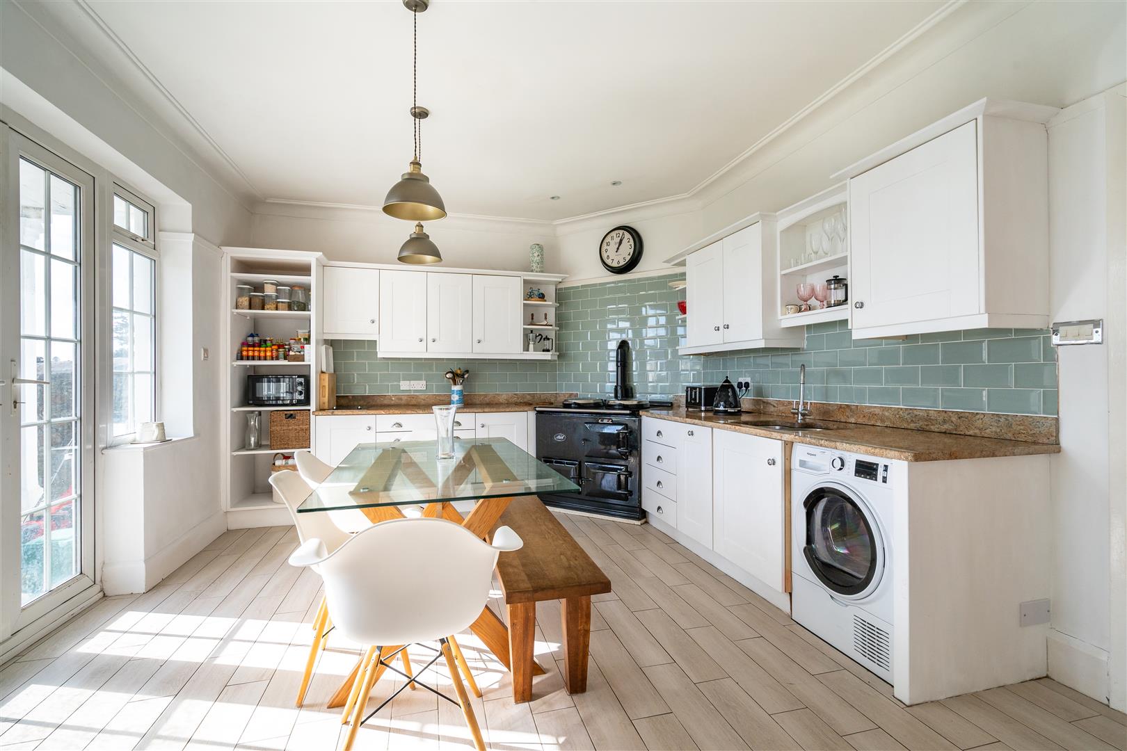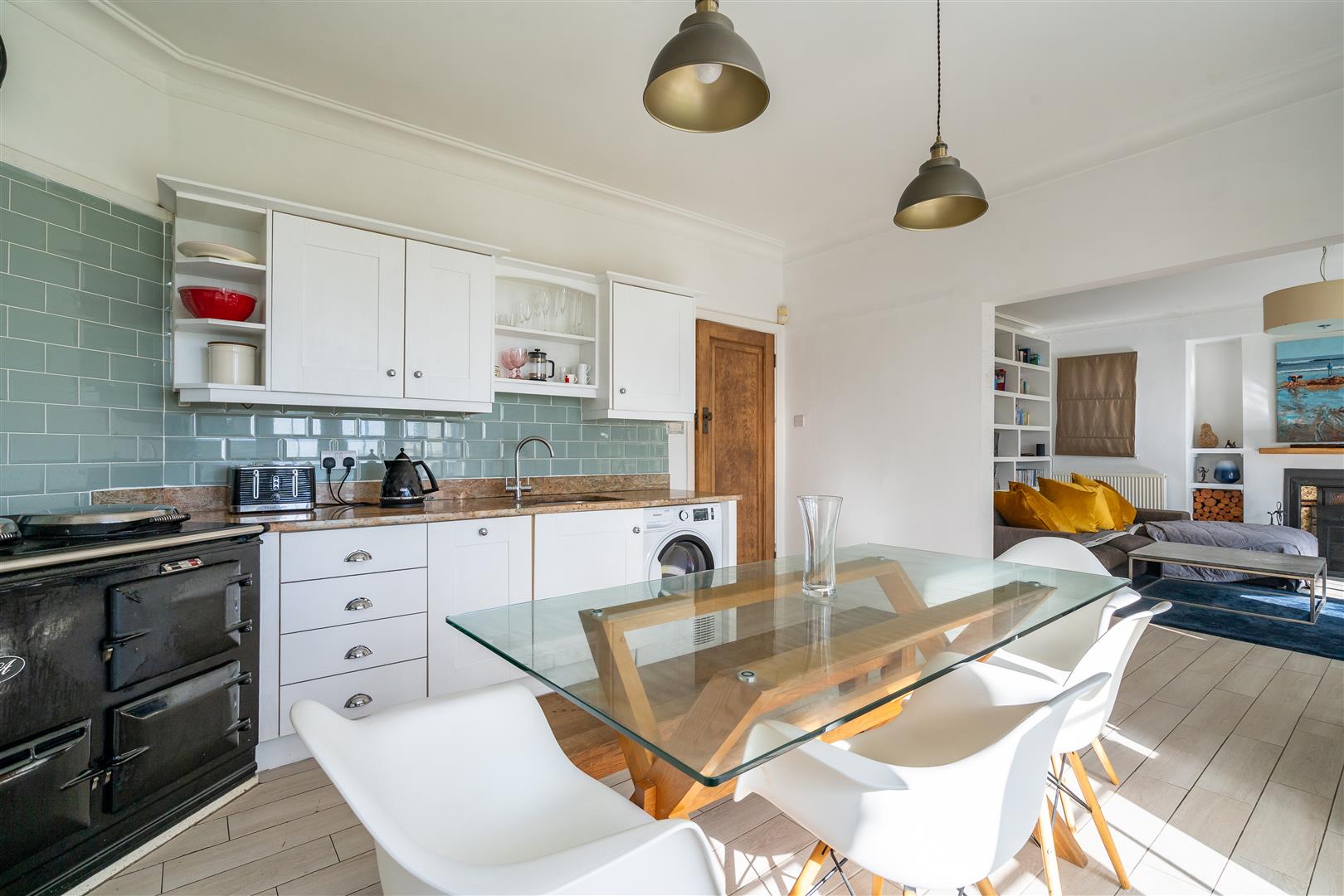 Both the kitchen/breakfast room and the living area enjoy views of the sun-drenched gardens to the south. The kitchen/breakfast room benefits from double doors that open directly onto the upper patio, offering a perfect vantage point over the level lawn below.