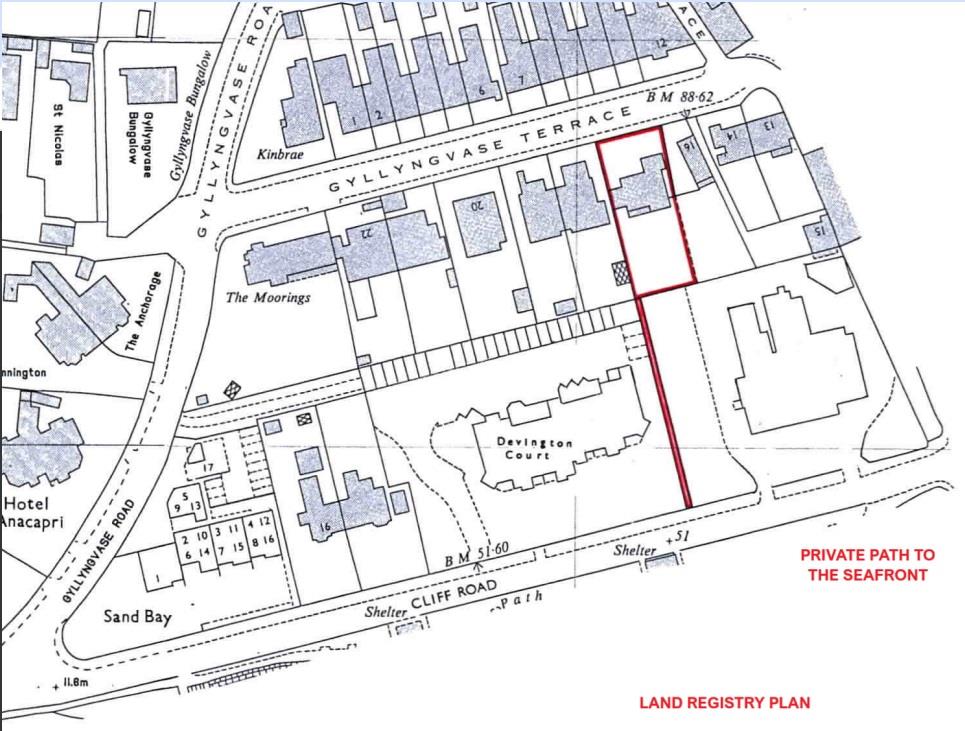 A highly unique feature of this property is its private ownership of a pathway that links the garden directly to Cliff Road, providing easy access to Falmouth Seafront. This pathway is a distinctive asset not found with any other property on Gyllyngvase Terrace. For reference, the title plan clearly illustrates the location of this pathway, situated between Devington Court and The Membly Hall Hotel.