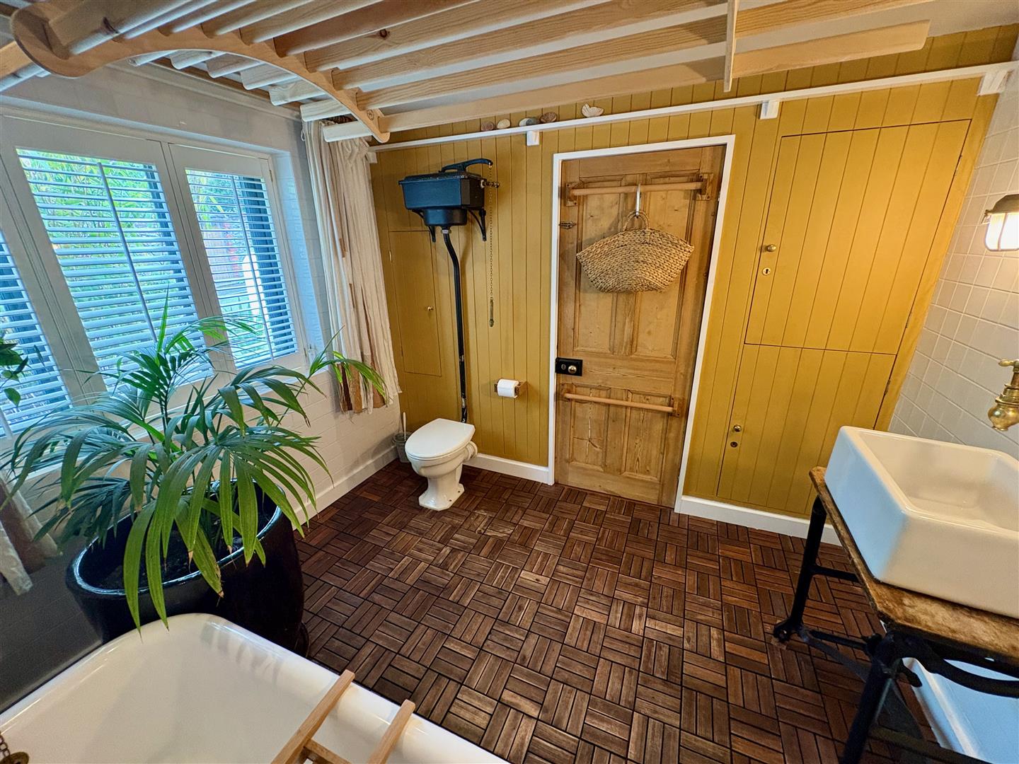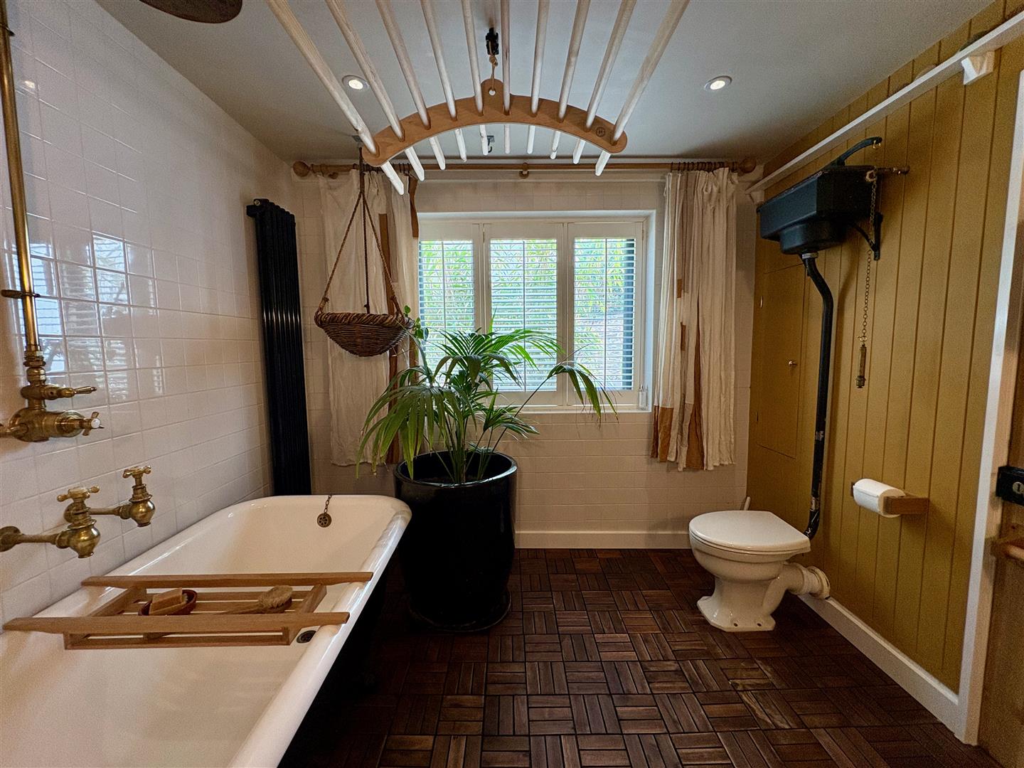 • Quality bathroom fittings including cast iron roll-top bath, brass taps, and copper shower head