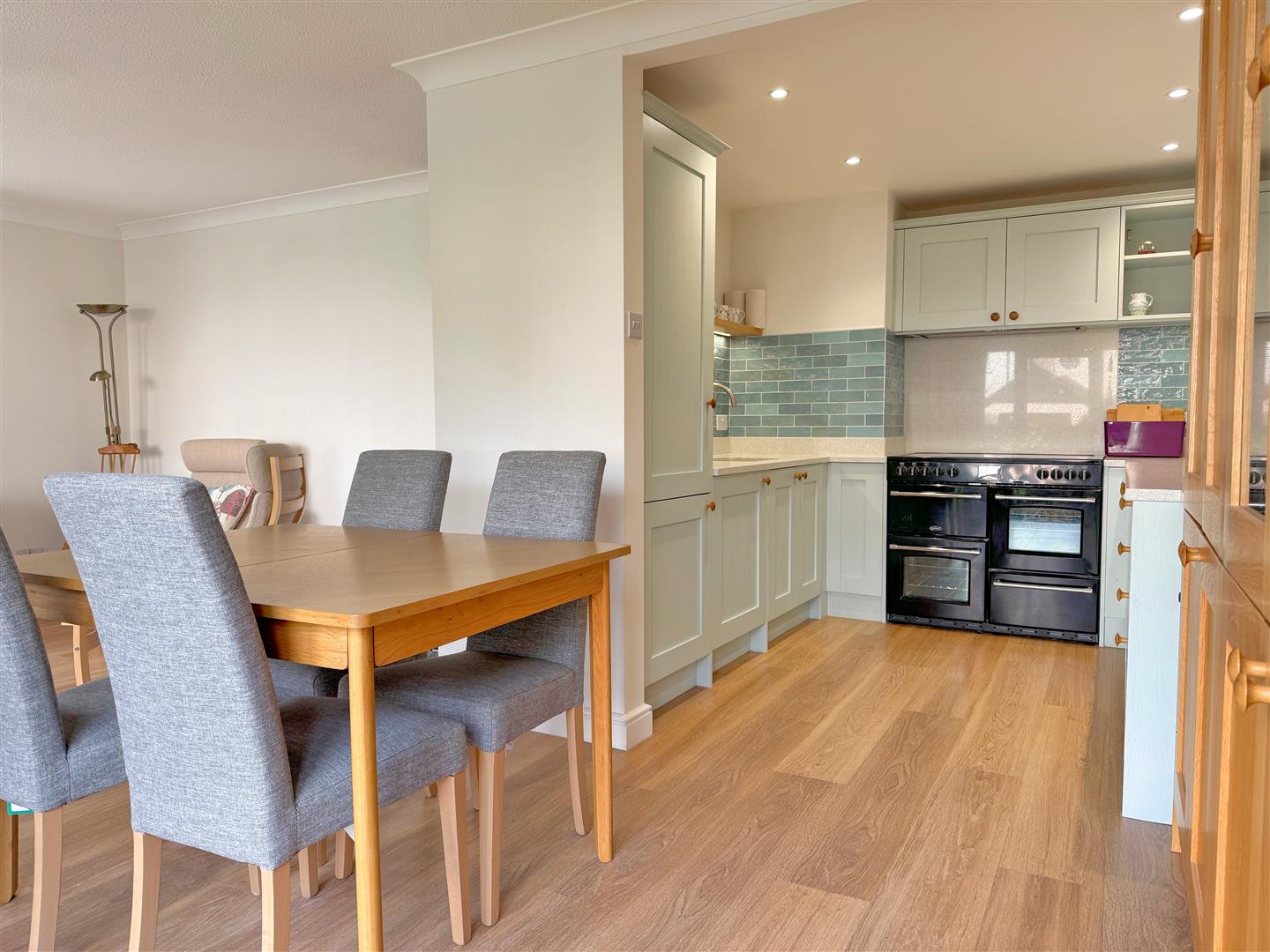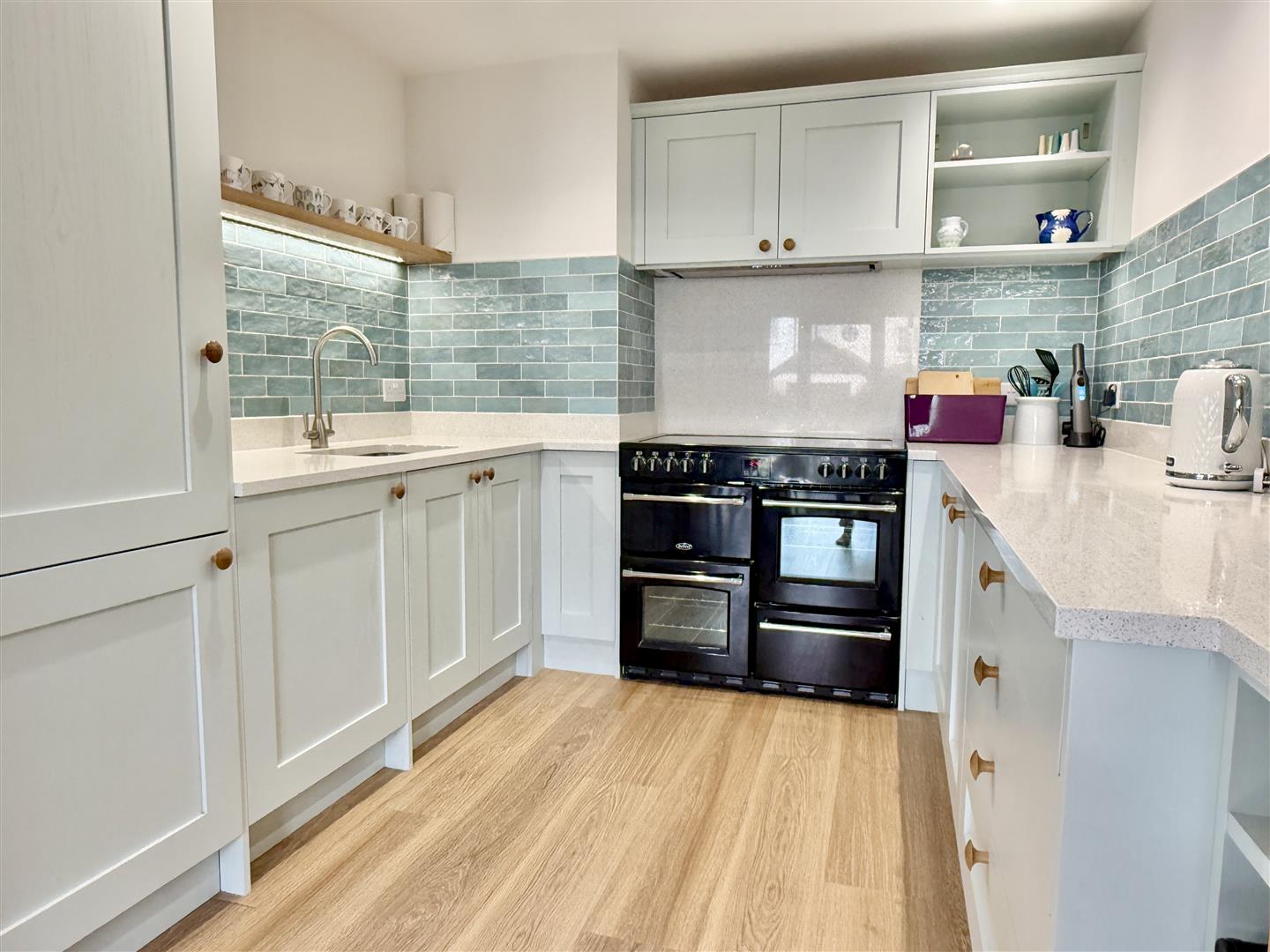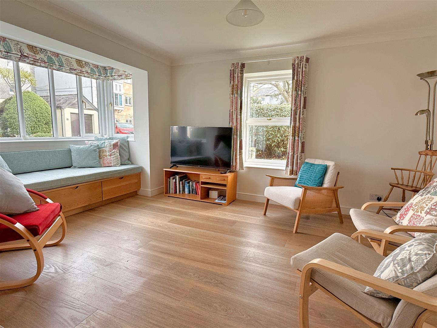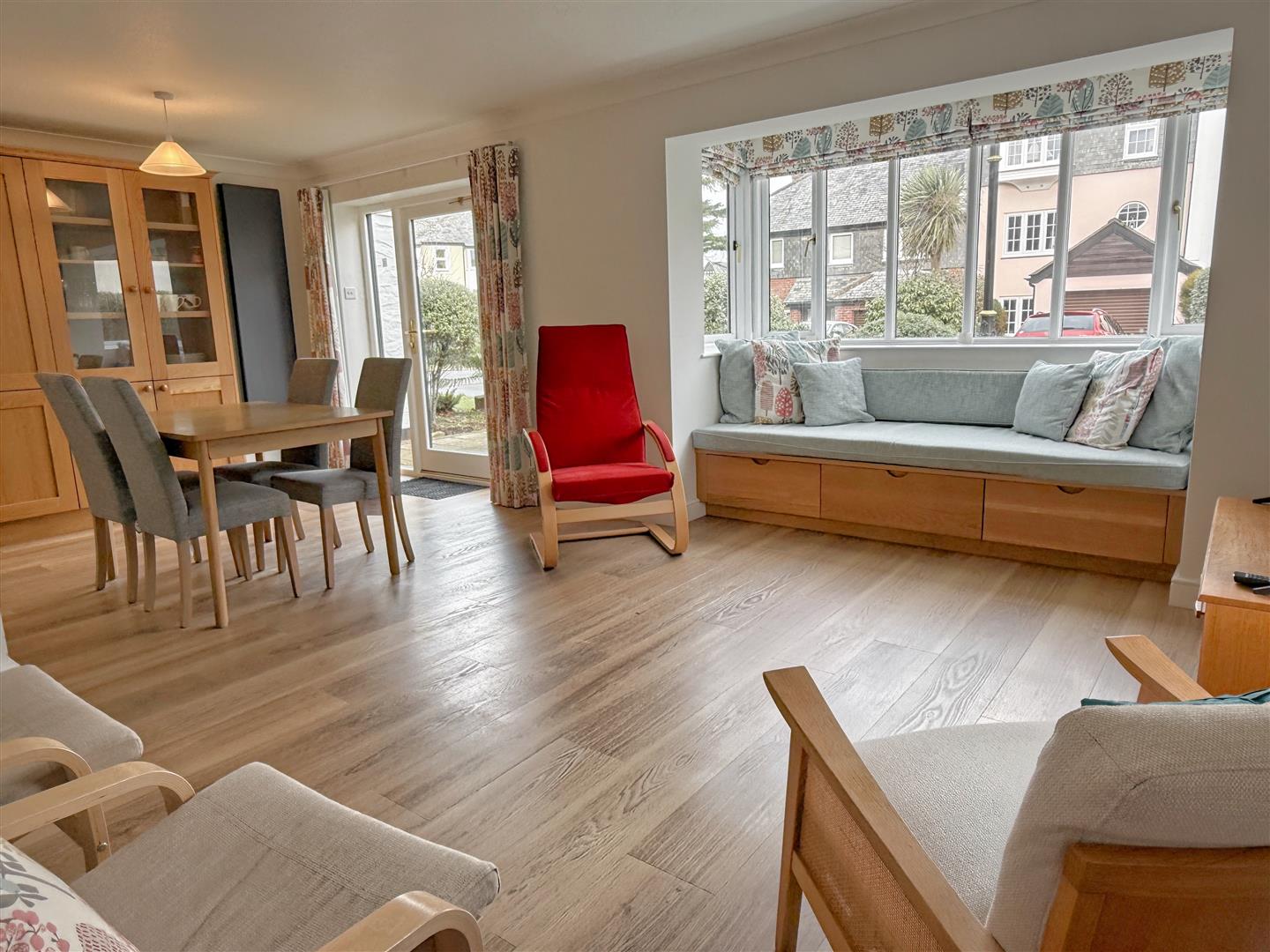 The apartment has been thoughtfully redesigned to create a light, open-plan living space with a broad bay window and an external door opening directly onto a patio and the attractively landscaped communal gardens beyond. The modern kitchen is smartly fitted with composite worktops, a range-style oven and hob, and integrated appliances, all arranged to make the space both sociable and practical.